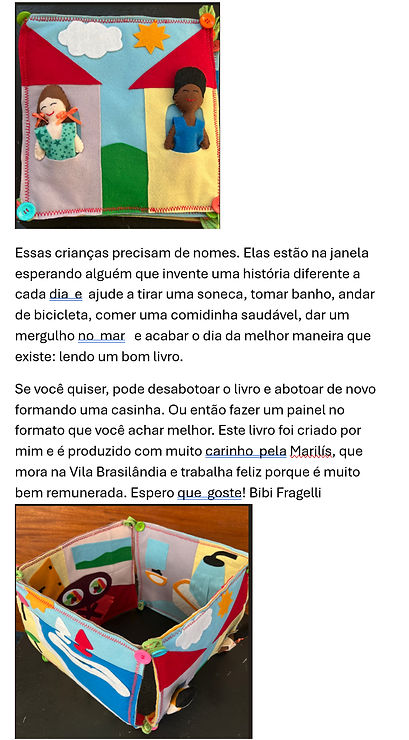 "É nós"é um super presente. Ele vem com o encarte ao lado, que sugere como brincar e mostra como ele vira casinha. Também tem um código QR que leva para o vídeo acima no YouTube. Também conta uma coisa muito importante do livrinho: ele é feito com todo o capricho por uma costureira muito bem remunerada.